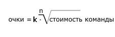 где n-это некий показатель. Очевидно, чем выше будет n, тем меньше будет зависимость очков от стоимости команды, при (n→∞) чемпионом может стать любой. Таким образом, можно сказать, что n — это фактор независмости чемпионата от денег.
