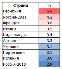 Вернёмся к нашим баранам. Можно вспомнить, что сезон-2010 в Российской Премьер-Лиге выдался весьма предсказуемым (n=2.9). Новый чемпионат начался намного веселее и безшабашнее. И хотя подводить итоги по 10 турам рановато, но поглядеть стоит: