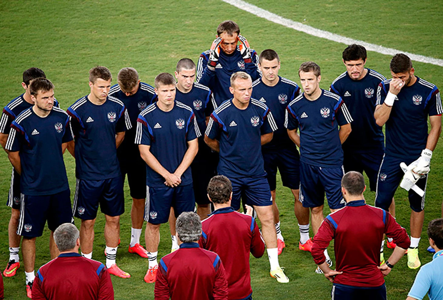 Сборной России проваливаться некуда. Она приехала в Бразилию без звезд, без лучшего игрока, без выдающихся побед в отборочном цикле и без каких-то серьезных задач – если не считать такой, конечно, выход из самой слабой группы чемпионата. Только что мы дружно аплодировали рекламному ролику народного немецкого авто: ура, в головах наших игроков появилась самоирония, в руках – табличка «Ваши ожидания – наши проблемы». Ролик и правда вышел классным, восторг – искренним, но давайте все же признаемся себе: никаких особенных ожиданий у нас и нет.