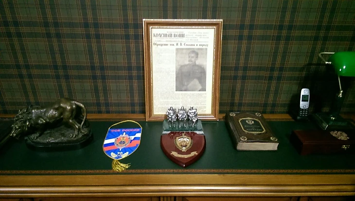 Стол в кабинете Дмитрия Носова. Над рабочим местом депутата также есть портрет Сталина