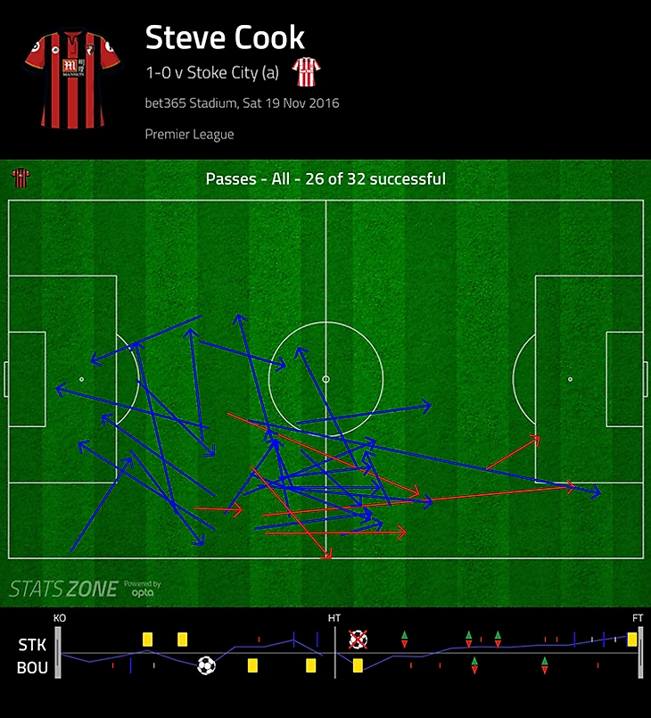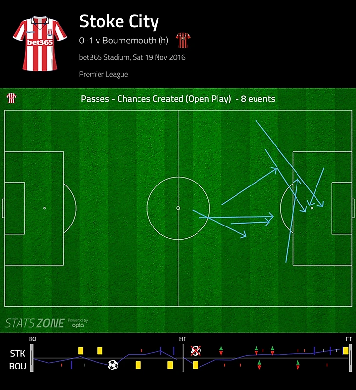 Перестановки принесли очевидную и неочевидную выгоду. Очевидная – победный гол Аке. Неочевидная – косвенно помогли оголять персональные ориентации, которые снова использовал «Сток». 3 игрока центра поля «Стока» ориентировались на 3 полузащитников «Борнмута», Бони – на одного из защитников, но кто-то из пары Кук-Аке оставался свободным. От ЦЗ в таком сценарии требовалось пользоваться тем, как партнеры уводят полузащитников «Стока», и доставлять мяч напрямую в полуфланги, предпочтительно низом.