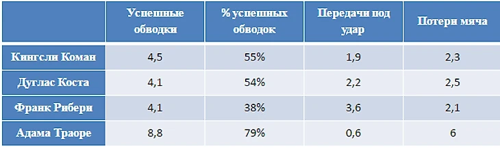 В АПЛ Траоре с приличным отрывом лидирует по количеству успешных обводок (здесь и далее расчет на 90 минут): 8,8 при проценте успеха равному 79%. Для справки: у ближайшего преследователя, Уилфрида Заха, лишь 5,3 обводки (64%). Однако в то же время у Адамы чудовищно много потерь мяча (в среднем 6 за 90 минут – больше всех в «Боро») и крайне мало передач под удар как для игрока его амплуа – всего 0,6. Насколько плохи подобные цифры? Для сравнения возьмем за условный эталон показатели 3-х лучших дриблеров «Баварии» сезона 2015/16 – команды, в которой делалась намеренная ставка на мастерство вингеров в ситуациях 1 в 1. Такое сравнение особенно актуально с учетом слухов о предметном интересе к игроку (воспитаннику «Барселоны») со стороны Пепа Гвардиолы еще в бытность последнего тренером мюнхенцев.