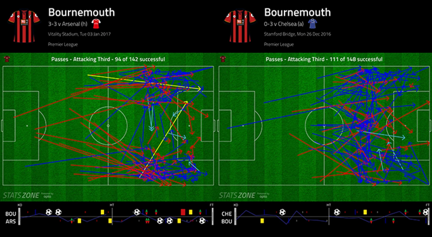 Также обратите внимание насколько более прямолинейно (что часто равняется быстро) «Борнмут» доставлял мяч на фланги – это здорово подчеркивает умышленность замысла с использованием оборонительной несостоятельности Санчеса и Ивоби.
