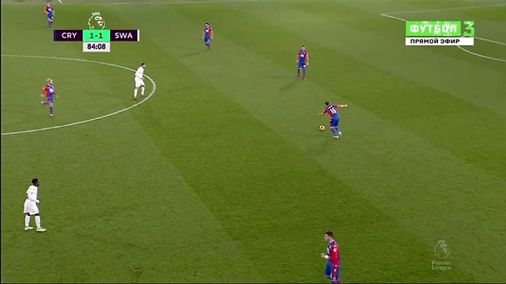 Большую часть второго тайма «Пэлас» проигрывал, и «Суонси» играл менее агрессивно без мяча. Вдобавок, вместо Бентеке появился Кэмпбэлл, и логика в игре лонгболлами слегка потеряла смысл. Тогда «орлы» пытались выводить мяч через короткий пас, но проблема заключалась в структуре и неготовности команды так играть. Часто возникали ситуации как на картинке сверху – Ледли стягивался в зону защиты, фулбеки при этом не поднимались высоко, Кабай в центре легко перекрывался – не удавалось создать следующую линию и всерьез затруднить «Суонси» защиту. Неудивительно, что «Пэлас» так и не создал достойных моментов после позиционных атак – только стандарты, либо шальной гол Заа после лонгболла (могли рассчитывать на два пенальти, но один после лонгболла, другой – после стандарта).