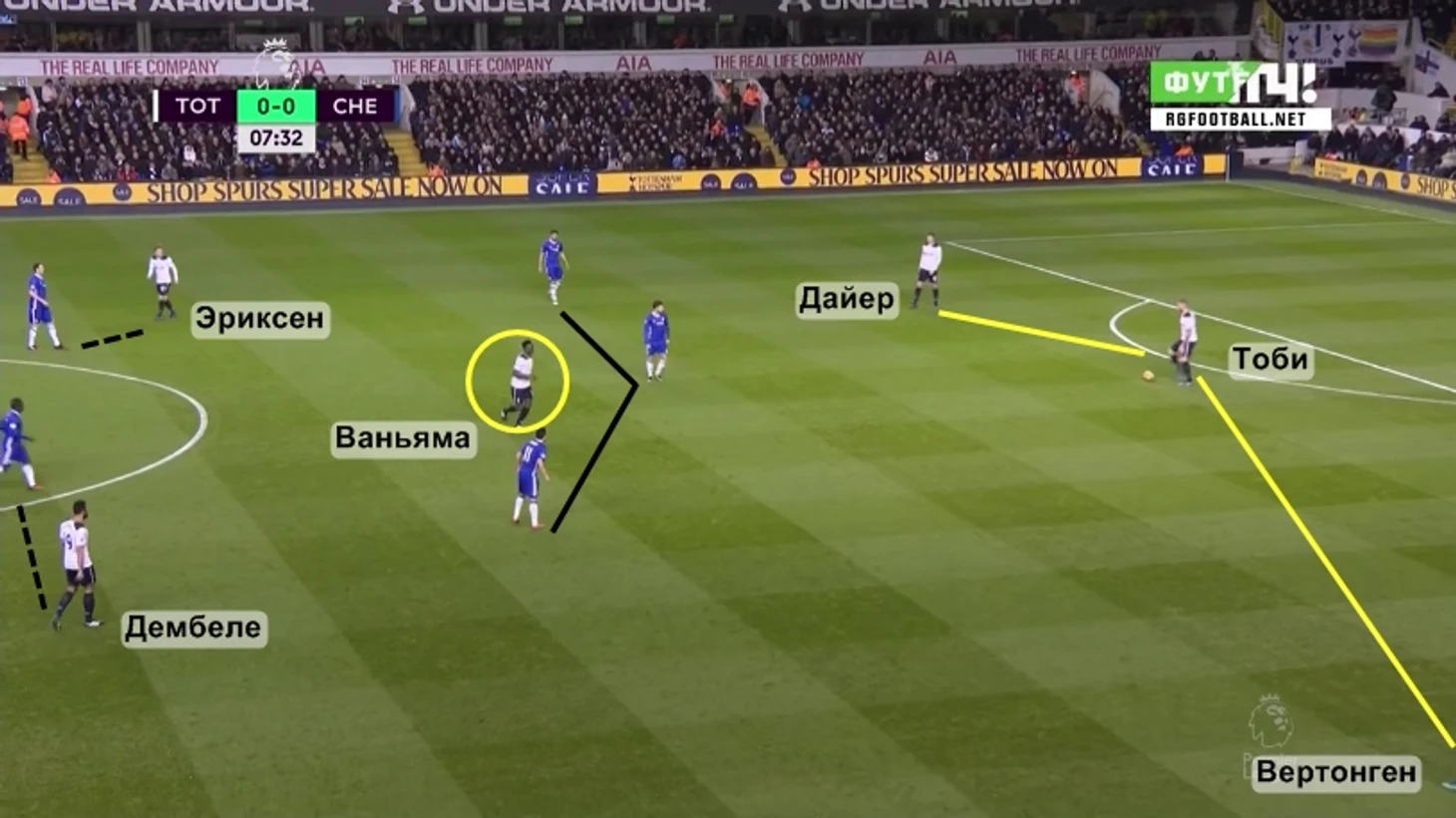 Канте и Матич в меньшинстве. Маурисио Почеттино выставил против «Челси» гибрид схем 3-4-3 и 3-5-2, где одна из ключевых ролей отводилась Кристиану Эриксену. Именно за счет перемещений датчанина между позициями правого вингера и правого ЦПЗ происходило изменение модели игры команды. Возможно, этот момент не был бы столь существенным (ведь футбол – игра динамичная, в которой различия между многими схемами весьма условны и незначительны), если бы не одно «но»: смещение Эриксена в центр поля позволяло создать ситуацию 3v2 против Н’Голо Канте и Неманьи Матича. Наличие свободного игрока в стратегически важной центральной зоне очень помогало «шпорам» как в прессинге (об этом – в тенденциях), так и в позиционной атаке. Например, во время билдапа один из тройки Эриксен-Дембеле-Ваньяма (как правило, последний) оказывался без опеки и мог помогать с продвижением мяча трем центрбекам. Правда, далеко не всегда команда грамотно распоряжалась созданным преимуществом.