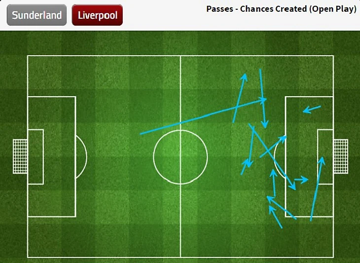 Персональные ориентировки в схеме «Сандерленда». Обычно «коты» играют 4-3-3, что гарантирует им некоторую стабильность в опорной зоне. Однако, против «Ливерпуля» Мойес избрал 4-4-2 (4-4-1-1), что вместе с персональными ориентировками вингеров приводило к ситуациям, когда «Сандерленд» оставался в численном меньшинстве в зоне перед обороной. Клайн и Милнер (Морено) одновременно поднимались высоко, вингеры следовали за ними, из-за чего в центре оставалось всего два человека. «Ливерпуль» неплохо использовал эти ситуации, создав достаточное количество шансов с игры из центральной зоны, либо получив возможность пробить оттуда.