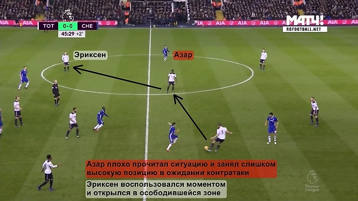Азар допустил ошибку в моменте с первым голом (плохо сориентировался в ситуации, выдвинулся вперёд, чтобы уйти в контратаку, тогда как мяч всё-таки остался у соперника), но в целом он действует в обороне вполне сносно. И нет, от Азара не требуется выполнение того объёма работы, который проделывают опорники. Достаточно просто находиться на своей позиции.
