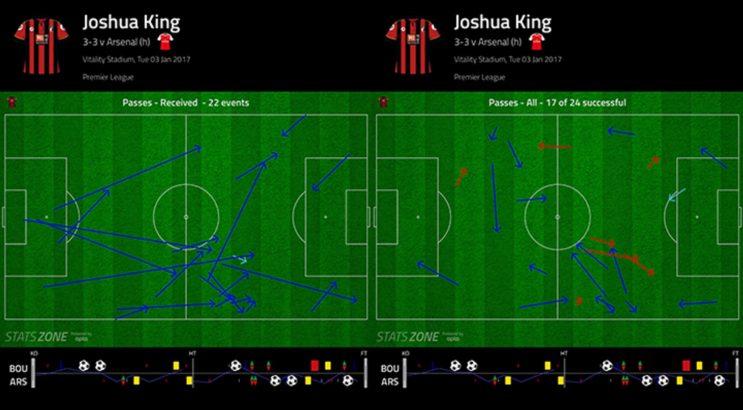 «Борнмут» перегружает фланги – «Арсенал» не справляется. Вторым ключевым компонентом плана Хау был упор на фланги. Это хорошо прослеживается через действия Кинга, номинально второго форварда/десятки: