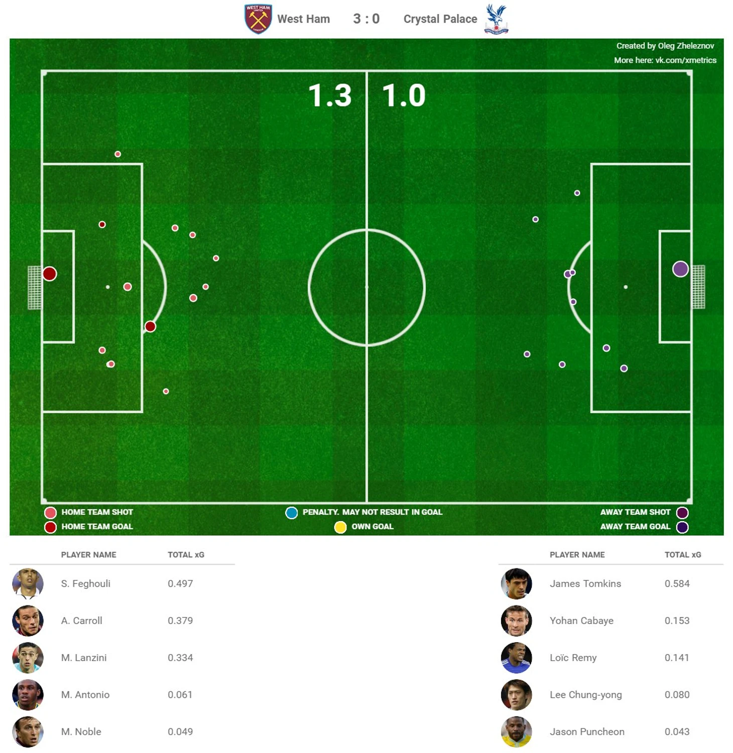 Пожалуй, самое мелкое лондонское дерби АПЛ завершилось в пользу «молотков». «Вест Хэм» часто сталкивается с проблемами, которые присущи шпорам – сбивается на дальние удары, которые не несут настоящей угрозы воротам соперника. Вдвойне удивительно это, потому что руководство «Вест Хэма» пользуется методологией xG для оценки состояния команды, однако Билич, похоже, про нее никогда не слышал. Подбор игроков у «молотков» позволяет создавать моменты намного качественнее чем есть. «Орлы» Сэма Эллардайса, кажется, все больше и больше идут ко дну. Пока непонятно как Биг Сэм собирается выправлять ситуацию – команда Пардью часто выглядела сильно против сильных соперников, после увольнения же «Кристал Пэлас» развалился и скорее надеется на удачу, чем собственный уровень. Лишь в самом первом матче, 26 декабря через три дня после назначения, «орлы» были острее соперника.