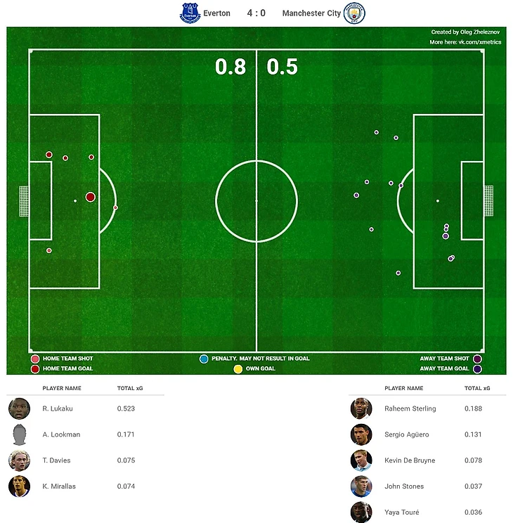 Гвардиола после матча сказал, что им не везет – ведь соперник лишь раз подходит к воротам и забивает гол. Однако, не везти может матч-два, но не весь сезон. Скорее всего имеют место ошибки в системе самого Пепа. Браво – вратарь, допускающий результативные ошибки на постоянной основе. Стоунз также далек от звания топ-защитник, как я от Луны. Да и в целом оборона «Манчестер Сити» слишком часто совершает ошибки, которые непременно сказываются на xG – например, вчерашняя ошибка Стоунза практически удвоила опасность удара Лукмана – 0.171 для такого острого угла – это очень большое значение. Но важно тут не то, что оборона допускает много ошибок, а то, что атака не в состоянии это компенсировать – 0.5 xG против «Эвертона», который во втором тайме серьезно подсел – это катастрофически мало для победы. В общем и целом случилось классическое поражение Гвардиолы – соперник вроде как не был особо опасен, а получили целую охапку. Может стоит все-таки играть на вынос, а не в короткий пас?