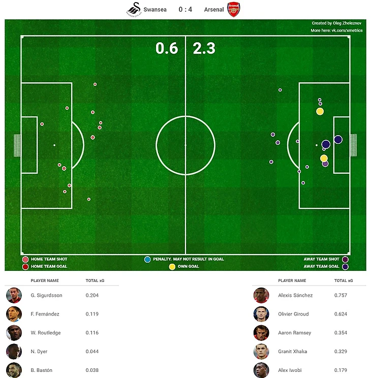 «Канониры» смогли реабилитироваться после невнятной игры с «Борнмутом», полностью переиграв «Суонси». Не очень понятно, чего хочет достичь руководство валлийцев, назначая вот уже третьего тренера за полгода – это верный путь в чемпионшип. Несмотря на то, что Клемент пообещал первым делом настроить оборону, пока что его обещания так и остались просто словами. «Арсенал» без проблем создал два очень качественных момента (голы Жиру и Санчеса), а ошибки в обороне «лебедей» привели к двум автоголам. Команды нанесли одинаковое количество ударов, однако «Суонси» страдает от их низкой эффективности – верный признак того, что креативная часть команды в тупике и не знает, что делать. Главное для Венгера сейчас не повторять старых ошибок и не разменивать Жиру на Уэлбека – Оливье играет действительно очень и очень важную роль для команды, создавая себе и партнерам большое количество xG.