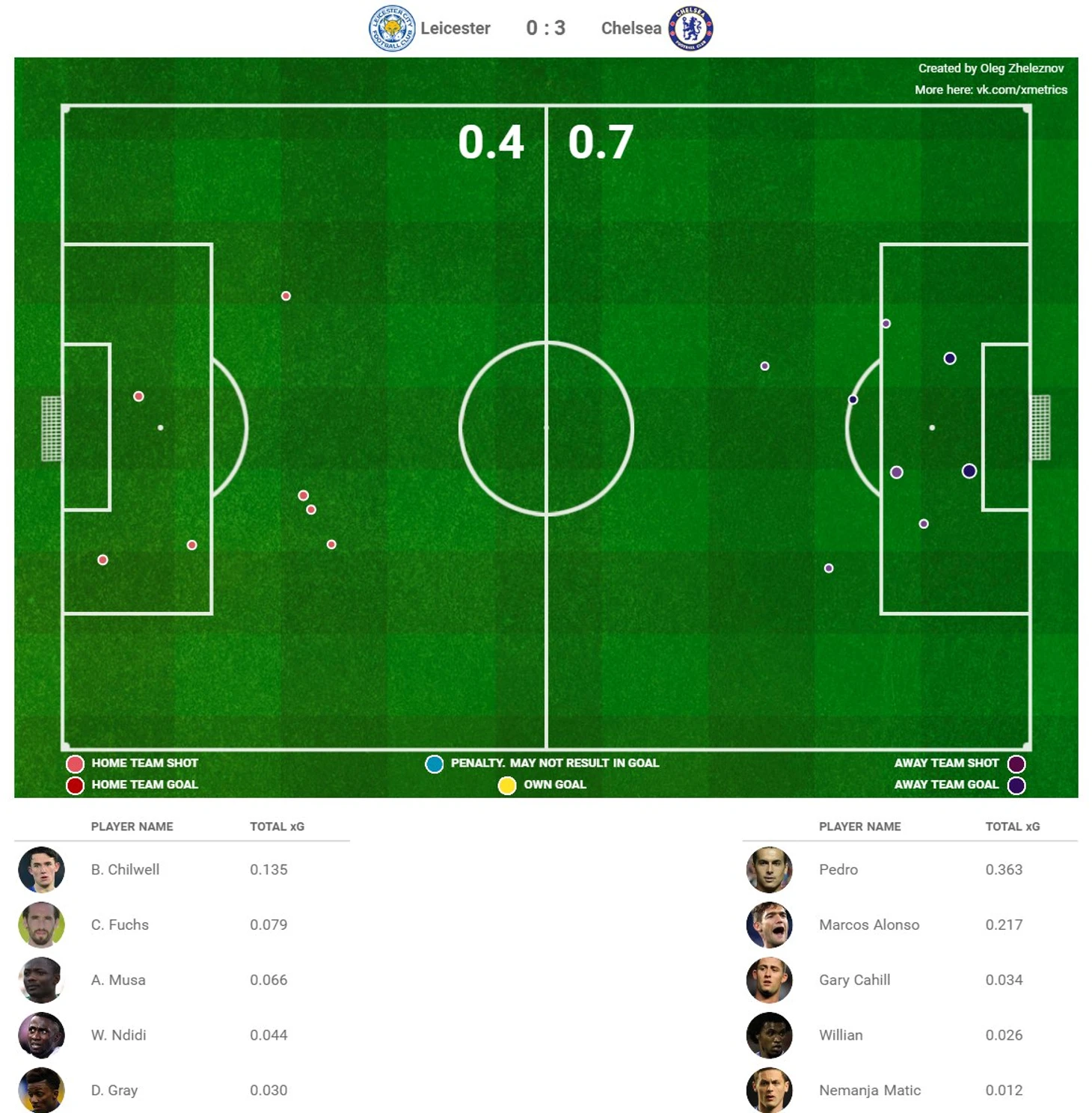 Несмотря на отсутствие Диего Косты, который за пару дней до матча пожаловался на боли в спине (так звучит официальная версия), «Челси» смог повторить тенденцию, которая имеет место уже около месяца – большое количество голов при малом количестве моментов и xG. Все три удара «Челси» в створ стали голами, а веса xG составили 0.136, 0.05 и 0.216 соответственно. То есть, даже в сумме, все три удара не дали бы и 50% вероятности забить. Я уверен, что такая конверсия вызывает боли не только у Косты. Схожее положение дел было свойственно прошлогоднему чемпиону «Лестеру», который повторить данную ситуацию не смог.