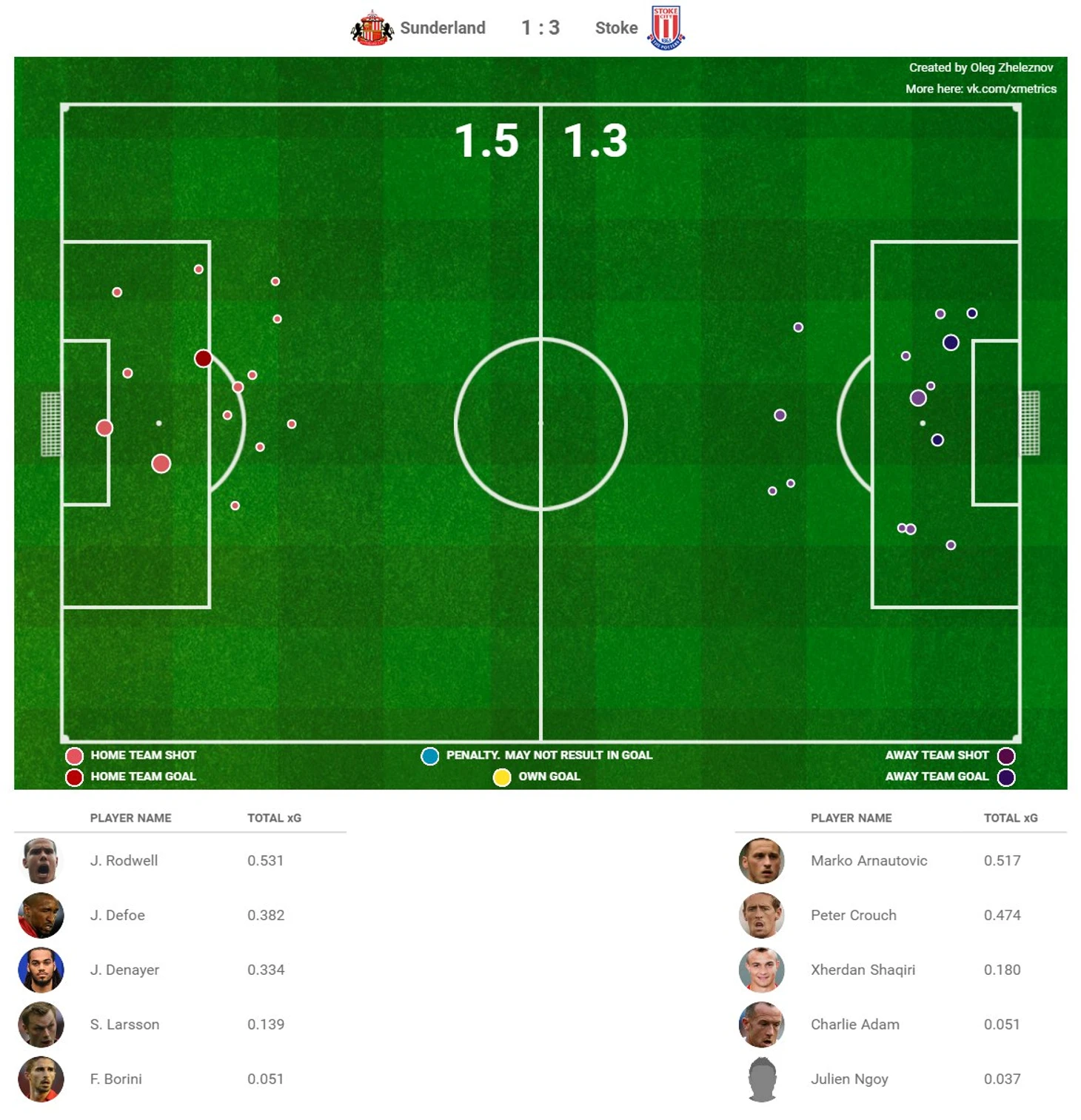«Сандерленду», кажется, пора в чемпионшип. Признаюсь, надеялся, что Дэвид выправит ситуацию, однако сомнений все больше и больше. Казалось бы, не все так плохо – «коты» недобирают очков, атакуют вполне неплохо для такого подбора игроков, однако неделя за неделей ничего не меняется – либо полнейшее поражение и по xG, и в матче, либо превосходство над соперником по моментам, которое не реализуется. Подозрительно напоминает матчи «Юнайтед» 2013\14 против андердогов. Думаю, что и руководству «Сандерленда», и Дэвиду, и игрокам стоит сезон поиграть во второй по значимости лиге, получит парашютные выплаты и вернуться сильнее. «Сток», кажется нашел свою игру – более прямолинейные забросы на Крауча и «классические» проходы по флангам в исполнении «гончаров» являются более грозным оружием, чем игра в мелкий пас от Афеллая и Бояна. При этом карта ударов «Стока» в последних матчах довольно плотная и сбалансированная – хороший знак, предвещающий дальнейший прогресс команды.