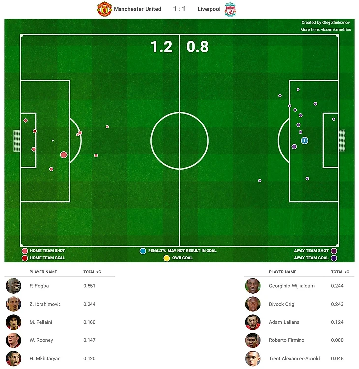 Главный матч выходных, пожалуй, разочаровал поклонников обеих команд. Ливерпуль, хоть и набрал больше xG 0.8 + пенальти против 1.2 у «Юнайтед», имел однако удары меньшего качества – 0.06(6) на удар против 0.13(3) у «Манчестера» – перевес практически двукратный. Исход матча решила глупейшая ошибка Погба – пожалуй, не случись пенальти, игра оказалась бы ярче. Надо также отметить, что большая часть опасности «красных», а также все три удара в створ (исключая пенальти) случились после замен Моуринью на атаку. «Ливерпуль» выступил слабее ожидаемого, однако еще слабее выступил «Юнайтед» – снова отсутствие реализации серьезных моментов (привет, Поль), необязательные нервы и ошибки. Считаю ничью справедливым результатом, потому что ни одна команда не была достаточно хороша для получения трех очков.