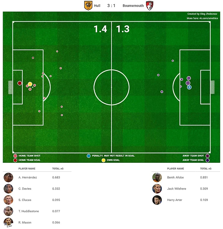 С самого начала чемпионата «Халл» был худшей командой лиги по xGd, однако создавал больше, чем «Бернли» или «Мидлсбро», которые гораздо выше в таблице и проблемы «тигров» были больше связаны с обороной, чем с атакой. Еще в последние недели руководства Фелана наметилась тенденция на улучшение результатов, которая вылилась в победу над «Борнмутом». «Вишням» же, похоже намного проще играть в открытый футбол без центра поля, чем проводить время осаждая чужие ворота, или обороняя свои. «Борнмут» одна из худших команд лиги по удержанию преимущества, так случилось и в этот раз. Я уже писал, что уважаю Хау за такой футбол, однако хочу обратить внимание на то, что очень часто моменты «Борнмута» выходят совсем неочевидными, и над этим, пожалуй, еще стоит поработать. «Халл» же должен стать гораздо более расторопным в обороне.