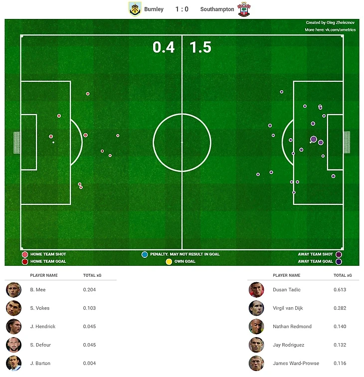 «Бернли» – удивительная команда. Одна очко на выезде, в том самом матче имени Хитона на «Олд Траффорд» и 25 очков дома и третье место в домашней таблице. При этом «Бернли» дома играет стабильно хуже конкурентов и забивает не то чтобы очевидные моменты. Например, в этом матче голом стал удар третий снизу по величине xG – шанс конвертации такого удара в гол составляет 0.4%. «Саутгемптону», должно быть, очень обидно за такое положение вещей. Однако, пенять тут стоит только на себя: транжирство моментов – болезнь, которую принес Пюэль. Клод, при этом лечить ее то ли не может, то ли не хочет. Нельзя претендовать на что-то выше квалификации в Лигу Европы, когда ты так часто упускаешь возможность забить. На данный момент разница между фактическими и ожидаемыми голами составляет практически -11 голов – это очень серьезная цифра.