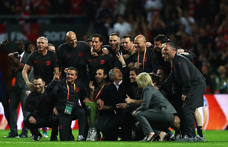 Жозе Моуринью и его тренерский штаб после победы в Лиге Европы