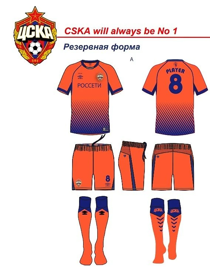 Третья форма ЦСКА выполнена в оранжевом цвете с синими элементами. Оранжевый цвет в форме армейцев использовался компанией Adidas в текущем сезоне 2017\18.