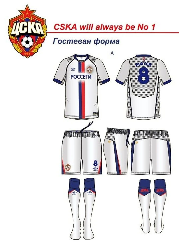Гостевая форма армейцев выполнена также в характерном для клуба цвете – белом. Главной деталью выездного комплекта является вертикальная красно-синяя полоса по длине всей майки, которая плавно прерывается в области логотипа спонсора.