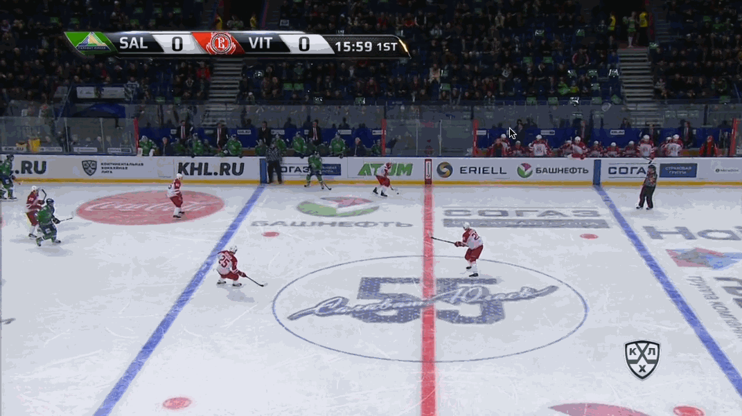 При всей вариативности в игре «Витязя» все-таки есть главная ценность — это простота. Среднюю зону всегда проходят как можно быстрее, самым простым способом – чем прямее, тем лучше. Это может быть пас по борту или проход Афиногенова, один из которых мы тоже увидим, или какая-то самая простая «двоечка». В этом случае «Салават» пошел меняться и слегка подставился, освободил среднюю зону для прямого прохода, но нас интересует, что команда Белова в принципе настроена проходить центр именно так. И потом — сразу на ворота: а ведь это с шайбой еще и защитник, Якуб Ержабек.
