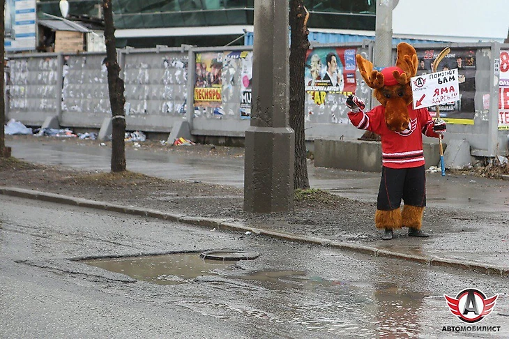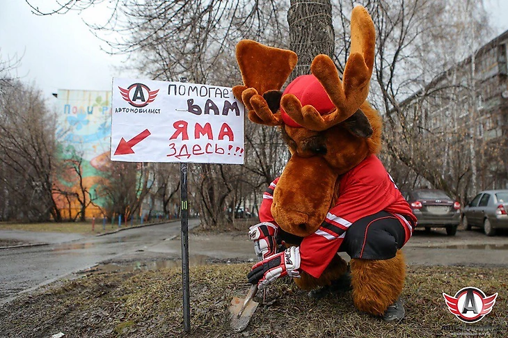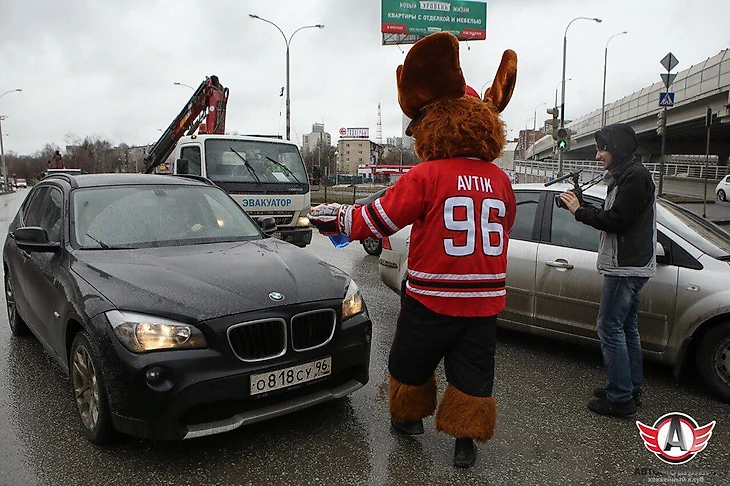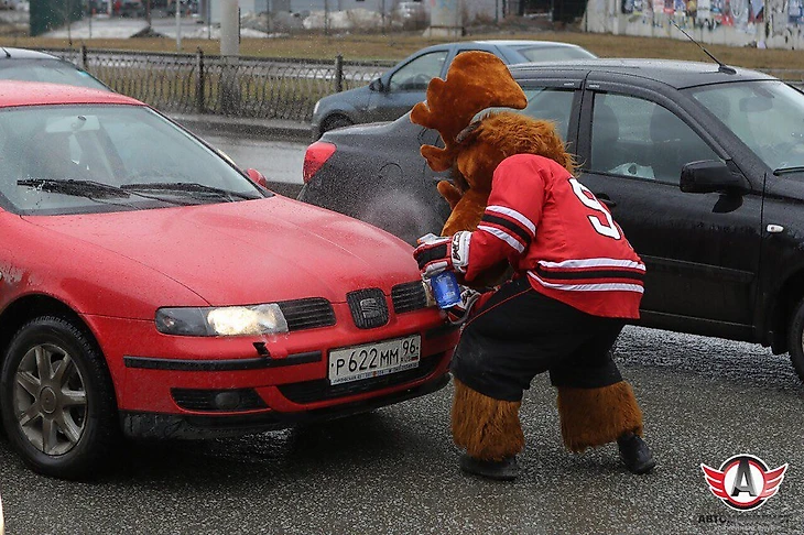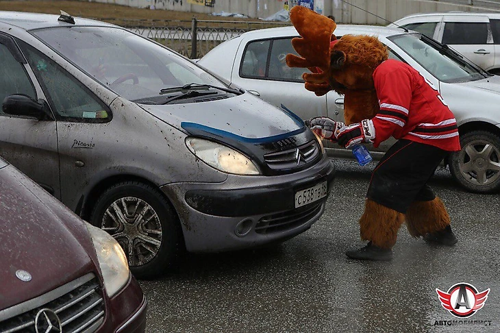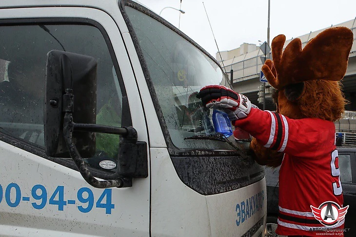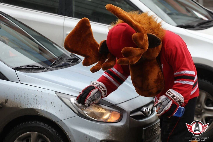 В рамках той же акции, которую клуб назвал «Автомобилист» против грязи», маскот команды – лось Автик – протирал фары машин на перекрестках города.