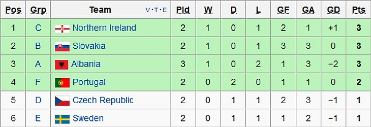 – если Словакия и Англия играют вничью, Россия становится третьей в группе и начинает мериться с другими третьими командами. При 4 набранных очках и как минимум неотрицательной разнице мячей не попасть в число 4 лучших сложно, но на всякий случай Уэльс, конечно, стоит обыграть покрупнее. Албания финишировала в группе А на 3-м месте всего с 3 очками, так что задача России еще упрощается: нужно опередить только одну из оставшихся третьих команд. Это не кажется особенно сложным: будет достаточно, например, поражения Северной Ирландии от Германии.