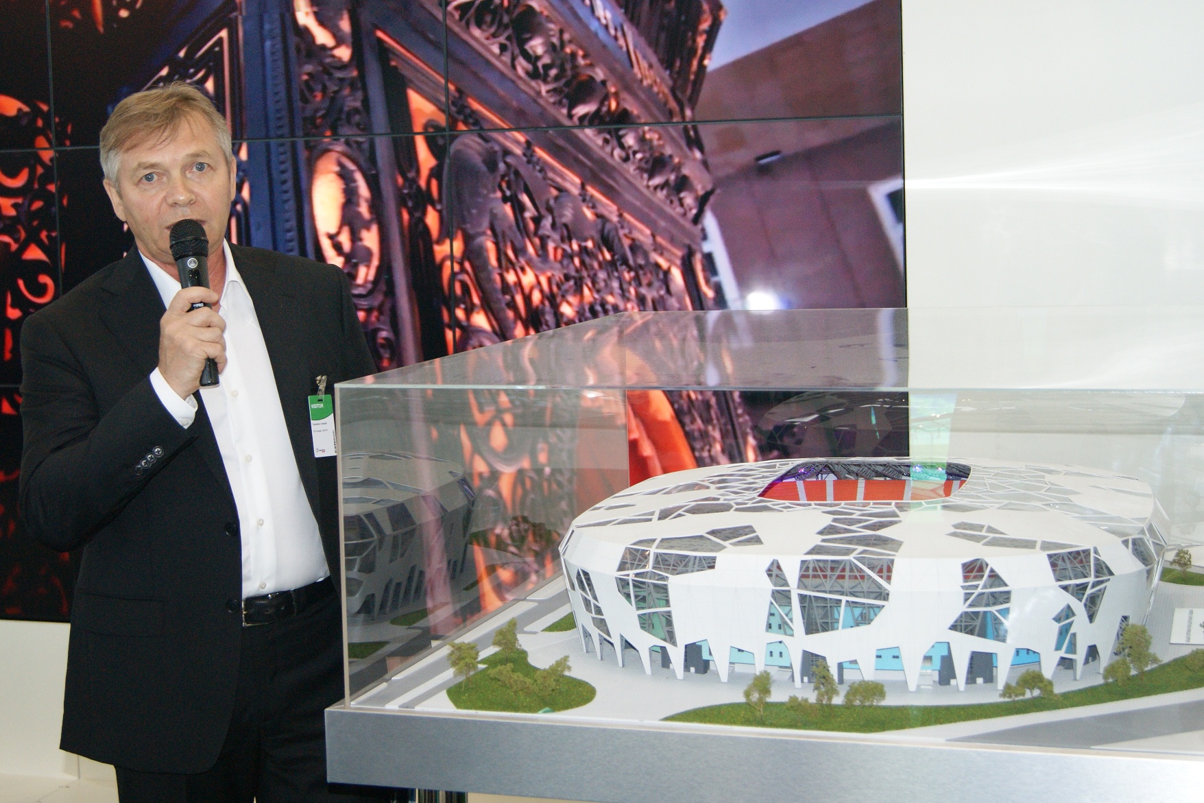 Автор проекта реконструкции Центрального стадиона Александр Куковякин с макетом "Уральского кристалла" на выставке "Иннопром-2014" - фото Андрей Андреев