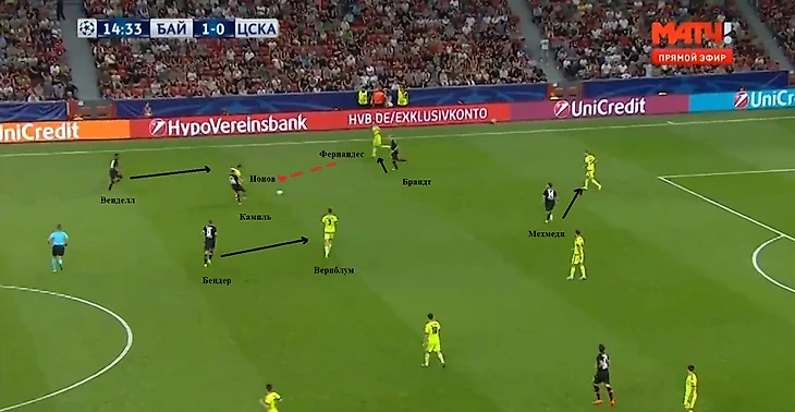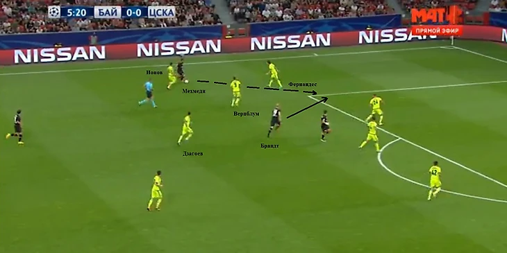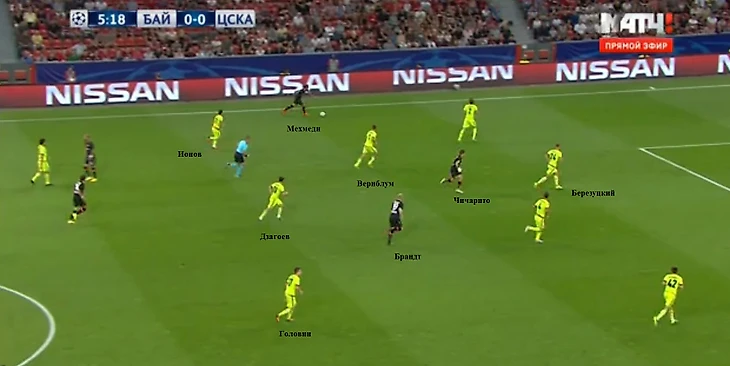 Крайние атакующие полузащитники «Байера» Мехмеди и Брандт очень часто смещались в центр, оставляя фланги для защитников Венделла и Хенрикса. Мехмеди и Брандт находили зоны между Вернблумом и Дзагоевым и защитниками ЦСКА и свободно получали в них мяч.