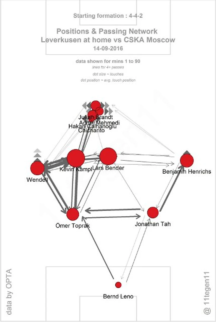 Расположение игроков «Байера» и карта передач леверкузенцев. Брандт, Мехмеди, Чалханоглу и Чичарито находятся на одной линии (в центре). Одна из самых интересных формаций первого тура Лиги чемпионов.