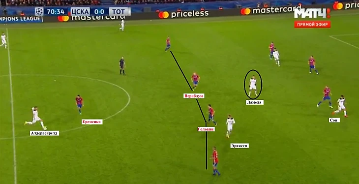 На этот раз между линиями армейцев оказывается не Алли, а Ламела. Еременко в очередной раз не накрывает передачу англичан из глубины поля. Головин готовится перехватить потенциальный пас на Эриксена, а вот Вернблум снова оказывается без игрока. Отвечать за опеку Ламелы должен был швед.