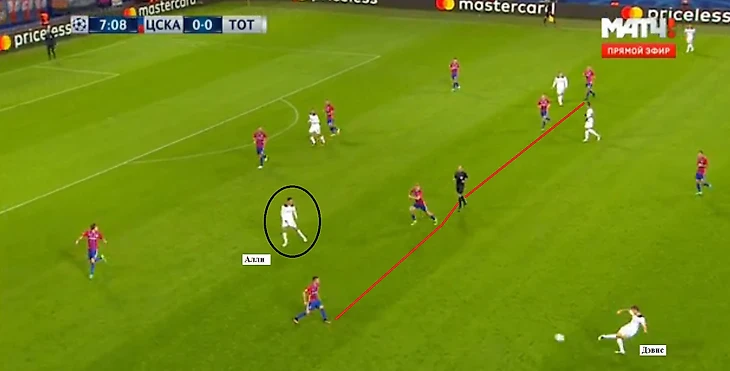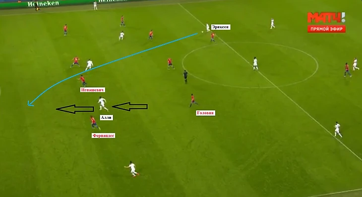 Эриксен получил мяч в центре поля, Еременко не успевает накрыть датчанина. Алли уходит от Головина и врывается в зону между Фернандесом и Игнашевичем, куда и идет длинная передача от Эриксена. Алли как следует обработать мяч не сумел, и лишь это спасло армейцев от больших неприятностей уже в первом тайме.