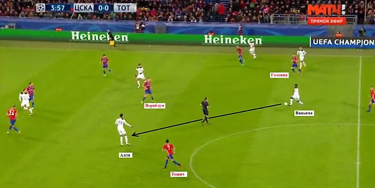 Несколькими секундами ранее Головин пошел прессинговать англичан на их половине поля. Александра в центре должен был подстраховать Тошич, но серб не успел вовремя сместиться со своего фланга, в результате между ним и Вернблумом образовалась свободная зона, куда ворвался Алли. Направление передачи, которую может отдать Ваньяма, очевидно, но кенийский хавбек запаздывает с пасом и делает его лишь через несколько секунд, когда Тошич уже повис на спине 20-го номера «шпор»