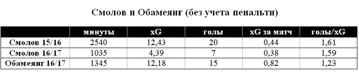 Обамеянг в сезоне 16/17 (в бундеслиге) за матч наносит 3,7 удара, при этом лишь 0,5 из них – из-за пределов штрафной. Показатели Смолова существенно отличаются – 5 ударов, половина из которых (2,5) наносится вне пределов штрафной и вратарской.
