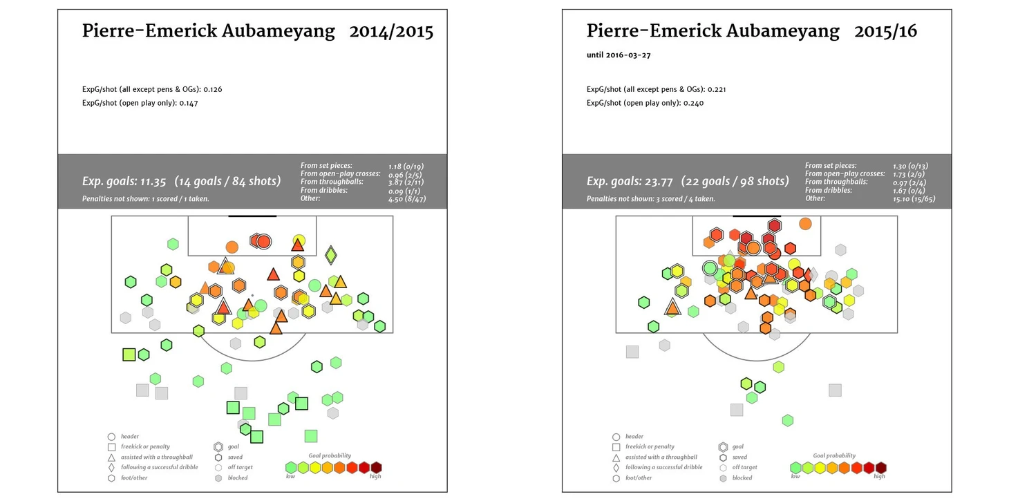 Подавляющую часть ударов в сезоне 15/16 Обамеянг наносил из штрафной площади, качество его ударов существенно увеличилось по сравнению с сезоном 14/15, и уж тем более с сезоном 13/14.