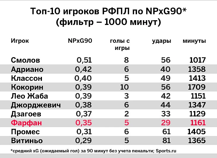 По общему числу ударов Джефферсон делит 23-е место в лиге с Фернандо, но по среднему качеству ударов за 90 минут (без учета пенальти) он в топ-10. Голы головой, мячи после отскоков (СКА, «Копенгаген») – так Фарфан забивал осенью-2017.