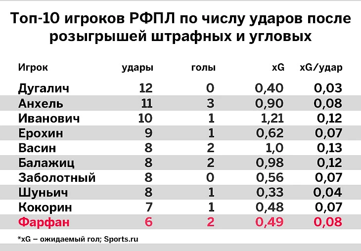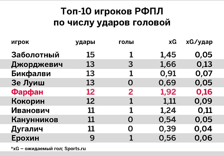 После розыгрыша углового Фарфан забил еще и «Уралу» (и тоже с ближней штанги – после скидки Антона Миранчука), а по числу ударов после штрафных (без учета прямых ударов) и угловых перуанец входит в топ-10 игроков лиги. При росте 174 см.