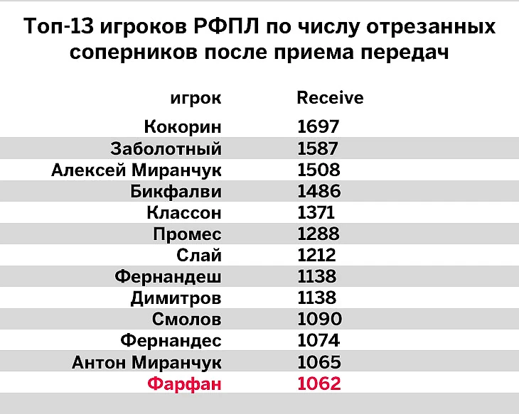 Эта атака «Локо» – идеальная иллюстрация команды Семина в первой части сезона. Обычно Фарфан отлично действует спиной к чужим воротам (матч с «Рубином» – исключение), а Фернандеш и Миранчуки забирают подборы. Вертикальная игра «Локомотива» отражается на статистике игроков атаки по Receive – количестве соперников, отрезанных от эпизода после приема передачи. Четыре игрока москвичей входят в топ-13 лиги – таких показателей нет ни у одной другой команды.