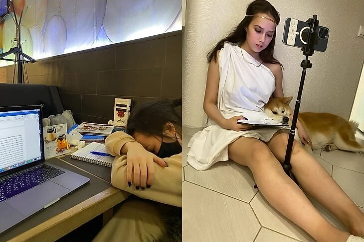 Сейчас Алина усердно готовится к первой сессии и пока не переживает насчет экзаменов – в инстаграме группы Тутберидзе шутит о зубрежке, делая вид что заснула, и примеряет античные наряды, читая Гомера.