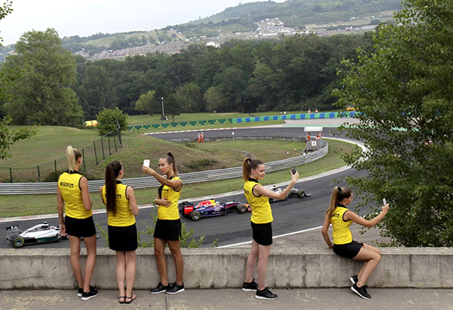 Девушки на «Хунгароринге» с интересом наблюдают захватывающую борьбу «Мерседесов» и «Ред Булл».