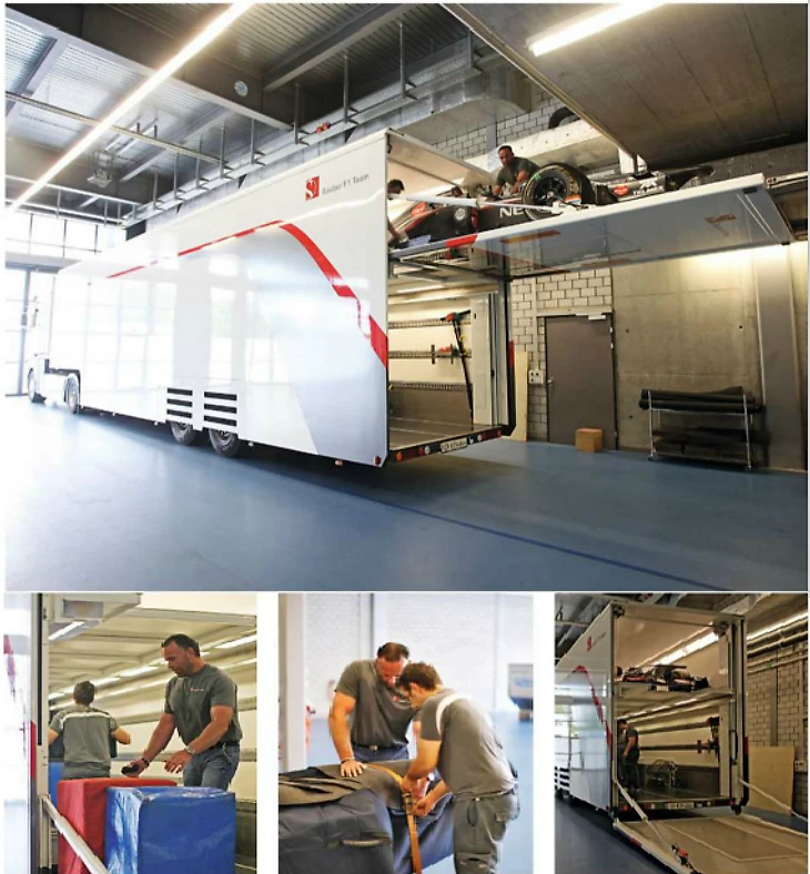 Весьма занимательный момент – погрузка всего необходимо оборудования. Для каждой грузовой машины у команды имеется определенный перечень того, что необходимо загрузить именно туда: двигатели, коробки передач, аэродинамические крылья и многое другое – все должно быть на своем месте. Поэтому главное правило логистов на командных базах – «ничего не забыть». Ведь в противном случае «забытая вещь» может обнаружиться только при полной разгрузке всех траков, а дополнительные издержки на заказ отдельного чартера и доставку этой детали не нужны никому. Во избежание подобных ситуаций к каждому загружаемому грузовику приставлен отдельный специалист, который фиксирует наличие всех необходимых деталей и оборудования. Число траков сильно варьируется: у команд с небольшим бюджетом их число редко превышает десять, в то время как у «Мерседеса», «Ред Булл» и «Феррари» зачастую переваливает за двадцать.