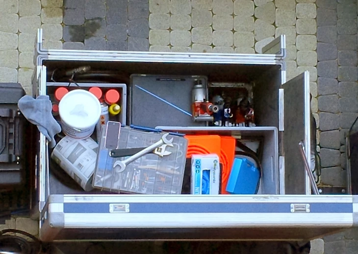 В одном из первых отсеков встречается стойка с наушниками и рациями – у каждого сотрудника индивидуальный комплект.