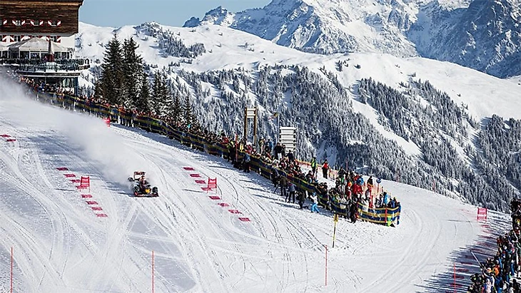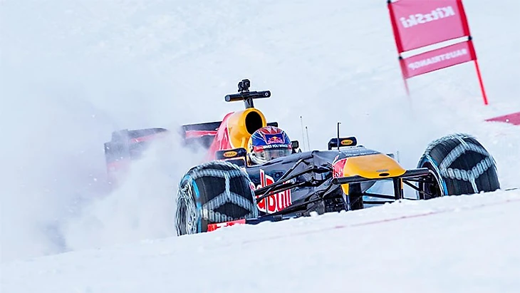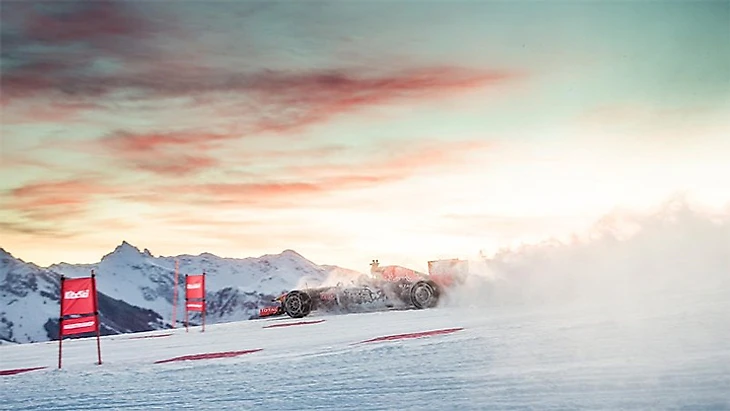 Болид «Формулы-1» покоряет горнолыжную трассу