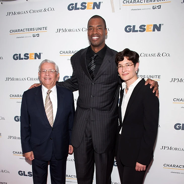 Джейсон Коллинз с бывшим комиссионером НБА Дэвидом Стерном и исполнительным директором Сети геев, лесбиянок и их гетеросексуальных друзей Элизой Байард.