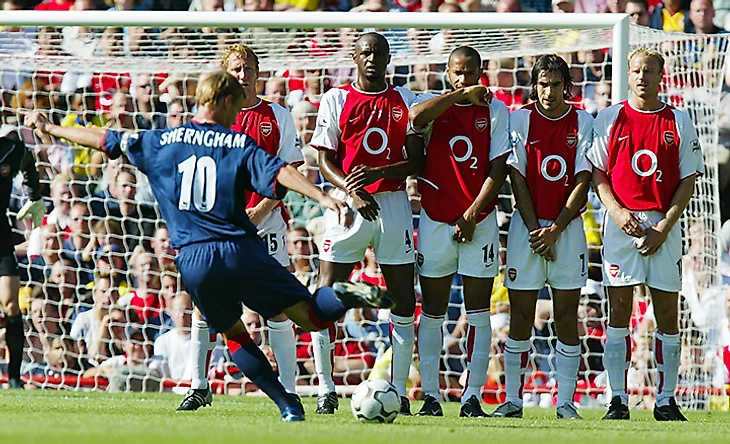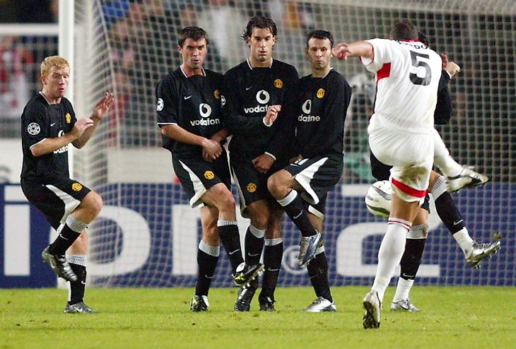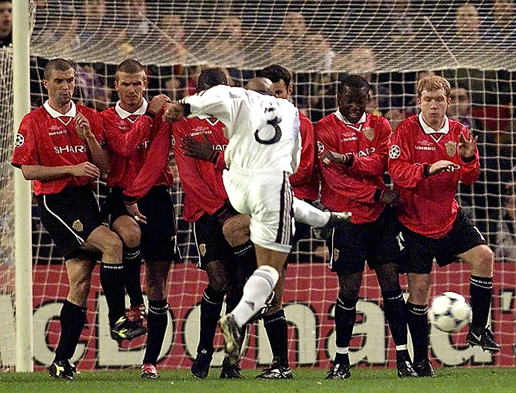Игроки «Манчестер Юнайтед» Рой Кин, Дэвид Бекхэм, Энди Коул, Райан Гиггз, Дуайт Йорк и Пол Скоулз пытаются остановить удар Роберто Карлоса.