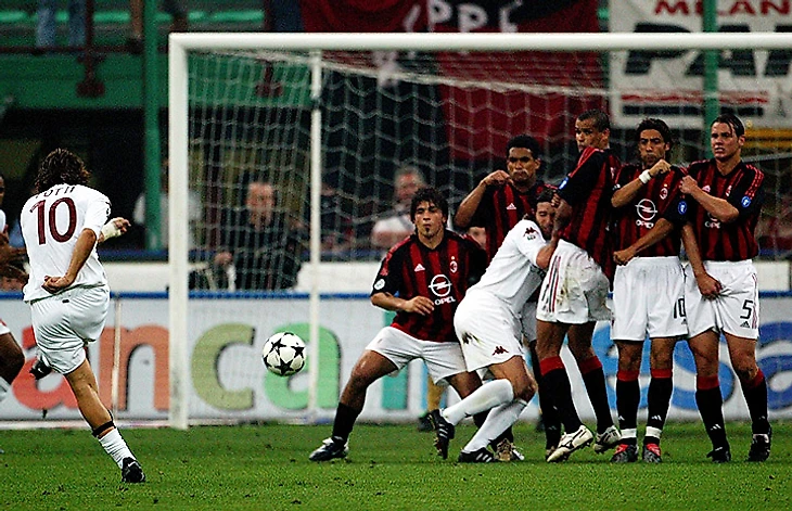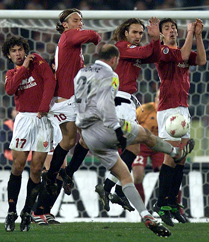 «Рома» выставляет Дамиано Томмази, Франческо Тотти, Габриэля Батистуту и Марко Дельвеккио – штрафной удар исполняет лидер «Ювентуса» Зинедин Зидан.
