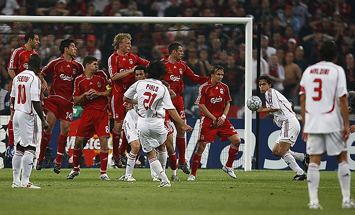 Удар Андреа Пирло, подправление Филиппо Индзаги – и счет в финале Лиги чемпионов -2007 открыт. Стенка, в которой были Хавьер Маскерано, Стивен Джеррард, Дирк Кюйт, Джейми Каррагер, не спасла «Ливерпуль».