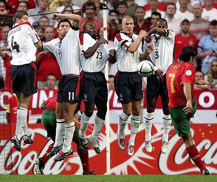 Луиш Фигу (Португалия) – Стивен Джеррард, Фрэнк Лэмпард, Дариус Васселл, Дэвид Бекхэм и Эшли Коул (Англия). Евро-2004.