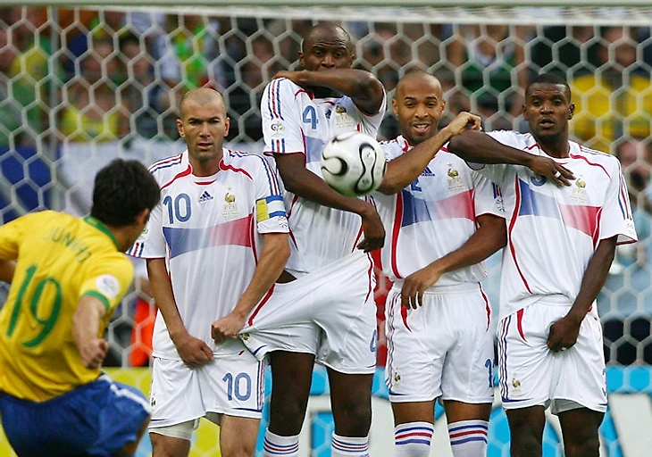 Зинедин Зидан, Патрик Виейра, Тьерри Анри и Эрик Абидаль против мастера штрафных Жуниньо Пернамбукано. ЧМ-2006.