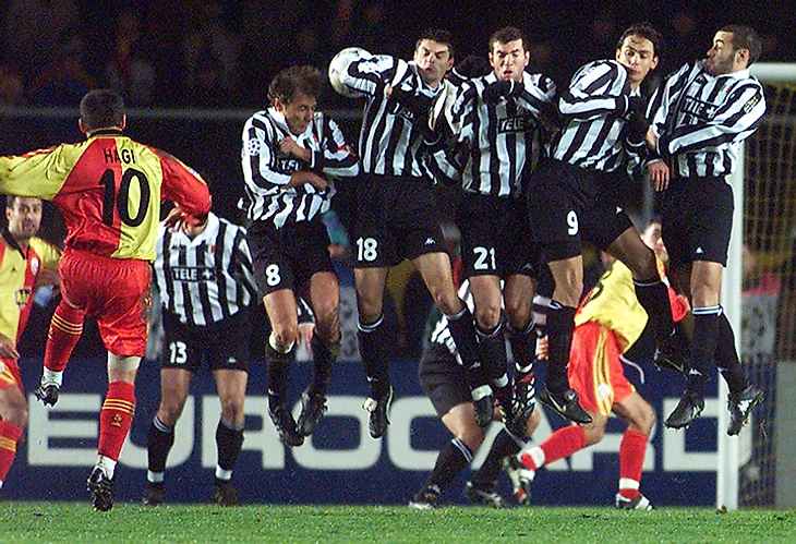 «Галатасарай» – «Ювентус», Лига чемпионов. Бьет Георге Хаджи – в стенке Марк Юлиано, Антонио Конте, Жослен Бланшар, Зинедин Зидан, Филиппо Индзаги и Джанлука Пессотто.