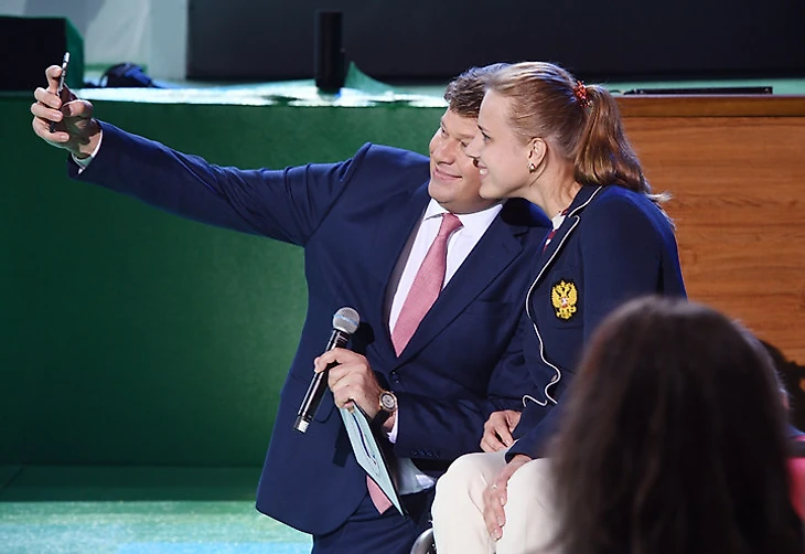 Комментатор Дмитрий Губерниев и фехтовальщица Виктория Бойкова.